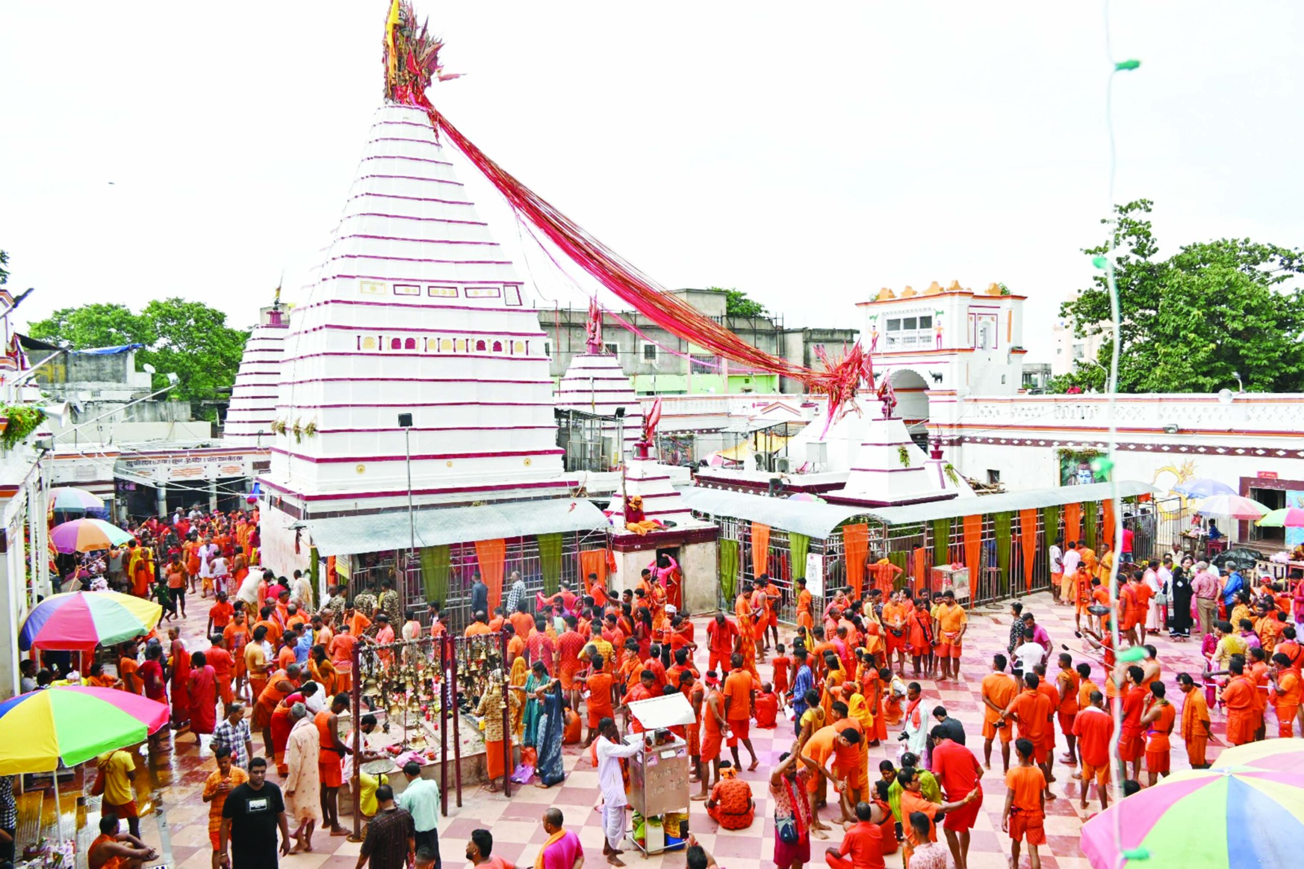 जरमुंडी | राजकीय श्रावणी मेला के 11 वें दिन गुरूवार को भी नागेश ज्योतिर्लिंग पर जलाभिषेक करने के लिए श्रद्धालुओं का जनशैलाब बासुकीनाथ धाम में उमड़ा। देश विदेश से बड़ी संख्या में कांवरिया श्रद्धालु बाबा बासुकीनाथ धाम पवित्र जलार्पण के लिए पहुंच रहे हैं। सावन कृष्ण द्वादशी, प्रदोष तिथि पर गुरुवार को शाम 5 बजे तक 75126 श्रद्धालुओं ने बाबा फौजदारी नाथ पर जलार्पण किया। बासुकीनाथ मंदिर कार्यालय से मिली जानकारी के मुताबिक श्रावणी मेला के 11वें दिन सामान्य रूट लाईन से कतारबद्ध होकर 65572 श्रद्धालुओं ने तथा 3754 श्रद्धालुओं ने शीघ्रदर्शनम से जलार्पण किया। वहीं बासुकीनाथ मंदिर कार्यालय से 300 रूपये के कूपन प्राप्त कर 3754 श्रद्धालुओं ने सीधे मंदिर में प्रवेश कर शीघ्रदर्शनम की सुविधा से जलाभिषेक किया। इसी प्रकार असमर्थ और बीमार, वृद्ध सरीखे श्रद्धालु, जो लाईन लगकर पूजा करने में असमर्थ थे। वैसे 5800 कुल 75126 श्रद्धालुओं ने शिवगंगा घाट और सिंहद्वार कीर्तनशाला में बने जलार्पण काऊंटर से पवित्र जल डालकर भगवान बासुकीनाथ को जलार्पण किया। यह जल जलार्पण काऊंटर से पाईप लाईन द्वारा सीधे बासुकीनाथ मंदिर के गर्भगृह में जाकर नागेश ज्योतिर्लिंग पर गिरता है। गुरुवार को श्रद्धालुओं ने जलार्पण काऊंटर से जल अर्पित करने के बाद एलईडी स्क्रीन पर भोलेनाथ बाबा बासुकीनाथ का लाईव दर्शन किया। बता दें कि गुरुवार को श्रावणी मेला के 11वें दिन पवित्र जलाभिषेक करने के लिए श्रद्धालु रात्रि के एक बजे से ही कांवरिया कतार में जुटने लगे थे। रात्रि के करीब 2 : 21 पूर्वाह्न पर बाबा बासुकीनाथ मंदिर के कपाट खुले और साफ सफाई होने के बाद नागेश ज्योतिर्लिंग की षोडशोपचार विधि से सरकारी प्रभात पूजा संपन्न हुई। सरकारी पूजा के बाद पंडा पुरोहितों और कांचा जल पूजन किया। इसके बाद तड़के सुबह 3 :21 पूर्वाह्न से श्रद्धालुओं के लिए बासुकीनाथ मंदिर को खोल दिया गया। अहले सुबह से दिन भर पूजा अर्चना जारी रही।कांवरियों की भीड़ से कांवरिया कतारें अविरल गंगा की धारा के रूप में प्रवाहित होती प्रतीत हुई। मानों मां गंगा केसरियामयी धारा बनकर नागेश ज्योतिर्लिंग का सतत आभिषेक करने निरंतर बासुकीनाथ मंदिर की ओर प्रवाहित हो रही थी। कांवरियों की आस्था का यह प्रवाह शाम पांच बजे तब जाकर करीब एक घंटे के लिए थमा।जब भोलेनाथ की दिवाकालीन विश्राम पूजा हुई। दिनभर भक्तों की पूजा अर्चना के बाद एक घंटे भोलेनाथ को विश्राम देने हेतु मंदिर के कपाट बंद किए गए। शाम 6:00बजे फिर से मंदिर के कपाट खुले।तब कांवरियों ने पुनः भोलेनाथ पर पवित्र जल अर्पित करना शुरू किया। यह क्रम रात्रिकालीन श्रृंगार पूजन तक निर्बाध रूप से जारी रहा।