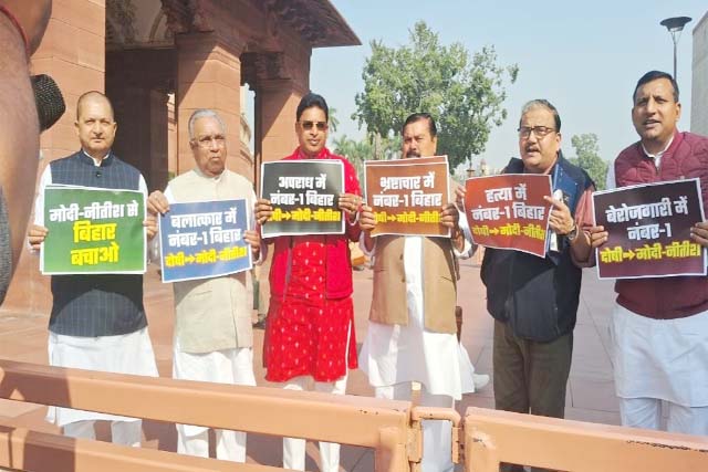 इससे पहले राष्ट्रीय जनता दल (राजद) के सांसदों ने मंगलवार को संसद भवन के मकर द्वार पर बिहार में बेरोजगारी, अपराध, बलात्कार, गरीबी, पलायन और अशिक्षा जैसे मुद्दों को लेकर प्रदर्शन किया। इस प्रदर्शन में राजद सांसद मनोज झा, प्रेम चंद गुप्ता और संजय यादव समेत कई सांसद शामिल हुए। इन सासंदों ने हाथों में बैनर और पोस्टर ले रखे थे।