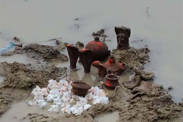 मिली जानकारी के अनुसार तालाब खुदाई के बाद हुई बारिश से मिट्टी धंस गई. इसके बाद जमीन के अंदर दबे कई मिट्टी के बर्तन, घड़े और टूटे हुए हिस्से बाहर दिखाई देने लगे. मौके पर कुछ बर्तनों के साथ पूजा में इस्तेमाल होने वाली सामग्री भी नजर आई. जिससे लोग इसे धार्मिक या पुराने समय से जुड़ा मान रहे हैं.