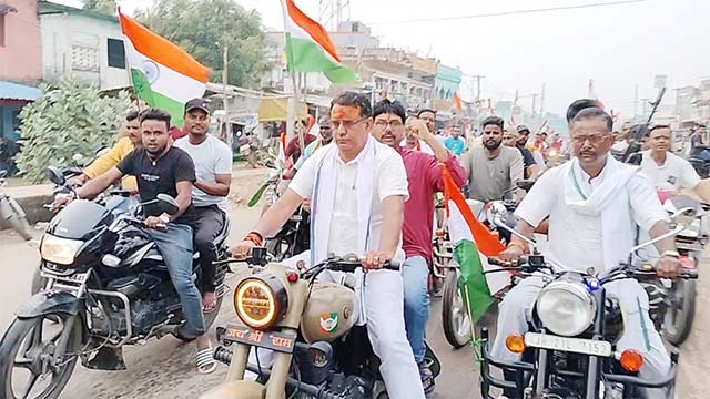 देवघर। भाजपा द्वारा हर घर तिरंगा अभियान कार्यक्रम के तहत सारठ विधायक रणधीर कुमार सिंह की अगुवाई में सारठ विधानसभा क्षेत्र में तिरंगा यात्रा निकाली गई। तिरंगा यात्रा चितरा सहरजोरी से शुरू हुई जो लगभग 25 किलोमीटर दूरी तय करते हुए नारंगी मोड़ होते हुए सारठ शहीद गणेश पाण्डेय चौक पहुंच कर विधायक श्री सिंह ने शहीद गणेश पाण्डेय स्मारक पर फूल माला अर्पित कर श्रद्धांजलि दी तत्पश्चात तिरंगा यात्रा को सारठ बजरंगबली चौक होते हुए सारठ पुराना बाजार होते हुए पुन: सारठ शहीद गणेश पाण्डेय चौक पर समापन किया गया। इस दौरान तिंरगा यात्रा में शामिल लोगों ने भारत माता की जय का उद्घोष से माहौल को देशभक्ति के रंग में रंग दिया। इस दौरान विधायक रणधीर कुमार सिंह ने कहा कि तिरंगा हमारे भारत की आन बान शान है। हमारा यह तिरंगा इसी तरह लहराता रहे आज हम सभी ने यह संकल्प लिया है। एक एक कार्यकर्ता पूरी निष्ठा से इस अभियान को सफल बनाने में लगे हुए हैं। उन्होंने यह भी कहा कि प्रधानमंत्री नरेंद्र मोदी के नेतृत्व में देश तेजी से तरक्की कर रहा बहुत जल्द हम अर्थव्यवस्था के मामले में विश्व में भारत अपना स्थान दर्ज कराते हुए सबसे बड़ी अर्थव्यवस्था होंगा। इस अभियान में बड़ी संख्या में भाजपा कार्यकर्ता गण मौजूद थे।